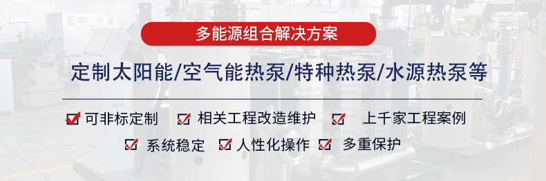 空气能加热装置主机选择:采用防爆型复叠式空气源热泵,主机包含压缩机、蒸发器、冷凝器、膨胀阀等。主要为井口采出气加热提供热源,出水温度80℃。